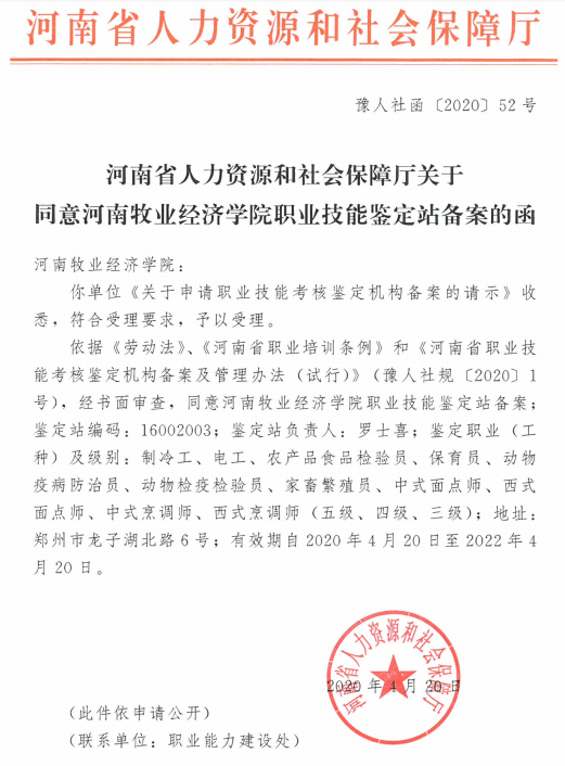 近日,河南省人力资源社会保障厅在回复给米乐官网的函中显示,MILE米乐官方网站职业技能鉴定站顺利通过备案。鉴定职业(工种)及级别有制冷工、电工、农产品食品检验员、保育员、动物疫病防治员、家畜繁殖员、中式面点师、西式面点师、中式烹调师、西式烹调师(五级、四级、三级)。