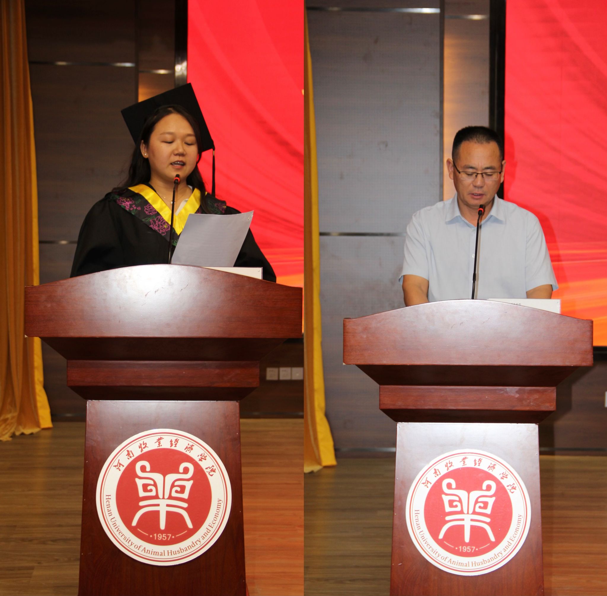 在欢快的乐曲中,岳校长、宋院长依次为取得学位的9位学生颁发学位证书,并为他们拨穗正冠。接着,与会领导分批为优秀毕业生颁发荣誉证书,为本专科毕业生代表颁发毕业证书。