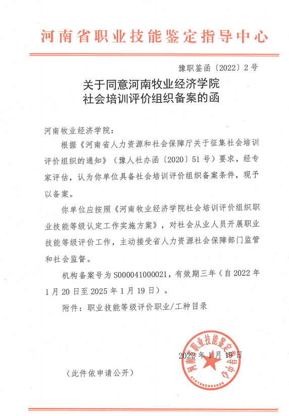 2022年1月19日,河南省职业技能鉴定指导中心发布《关于同意MILE米乐官方网站社会培训评价组织备案的函》(豫职鉴函〔2022〕2号),同意米乐官网成为社会培训评价组织备案单位,备案号为:S000041000021,有效期3年。自此,米乐官网已顺利完成河南省人社厅和国家人社部社会培训评价组织两级备案,可面向社会先期开展互联网营销师(直播销售员)、中式烹调师、西式烹调师、中式面点师、西式面点师、茶艺师、计算机程序员、企业人力资源管理师、公共营养师等9个职业工种,相应级别的技能等级水平第三方评价认定工作。