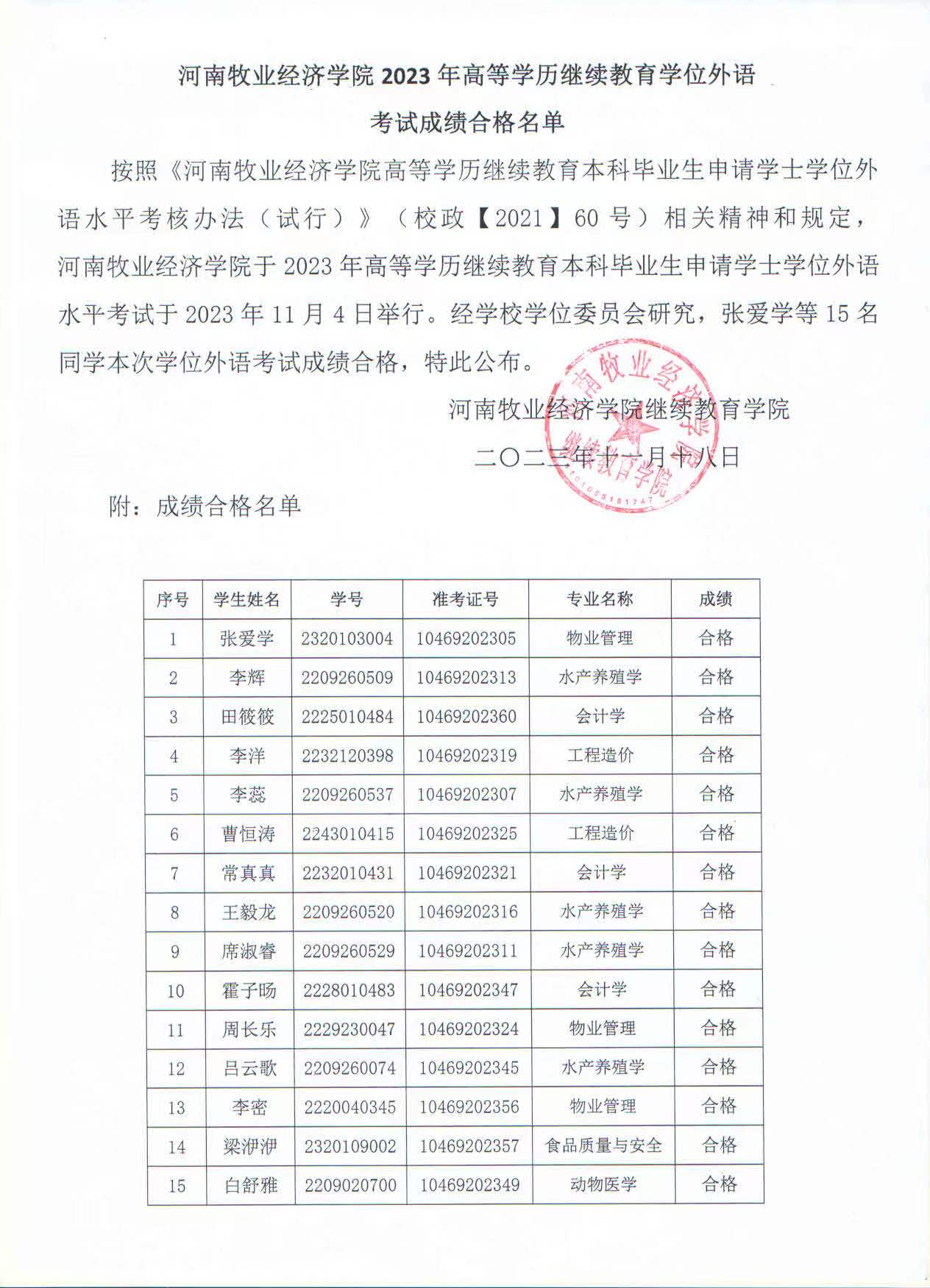 MILE米乐官方网站2023年高等学历继续教育学位外语考试成绩合格名单